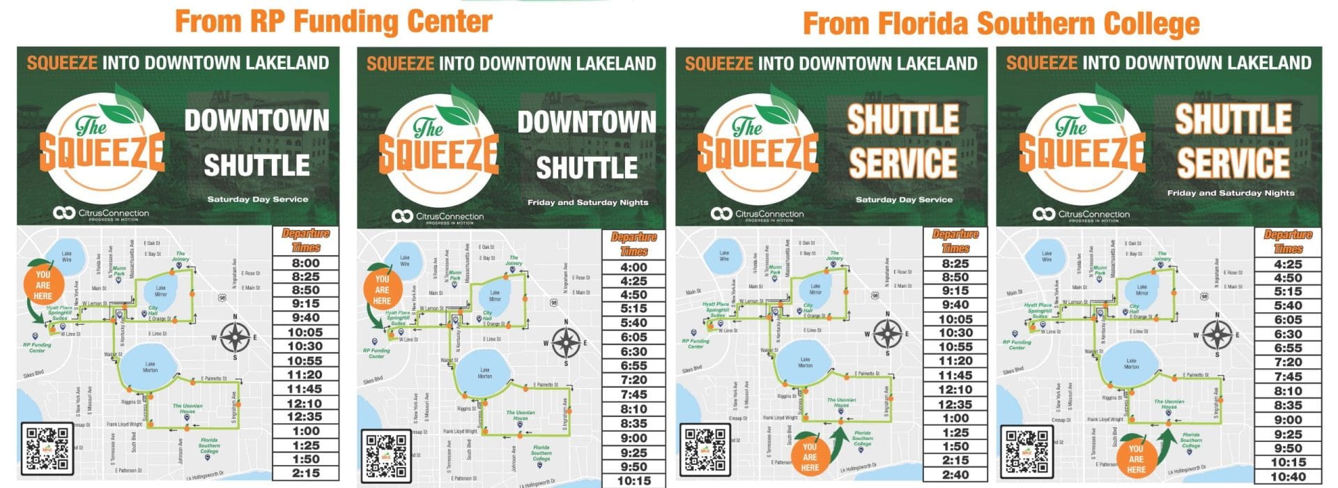 Citrus Connection’s Squeeze service operates in downtown Lakeland, Lake Wales, and Bartow (starting August 5) providing easy transportation to local professionals and visitors that’s fast, frequent, fun and FREE!